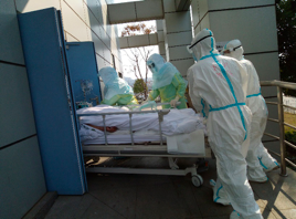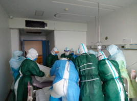 经过我们的积极治疗,该患者的生命体征逐步稳定,但是由于该患者的病情太过危重,需要长时间的机械通气以及更进一步的生命支持治疗,所以我们一致决定将患者转到重症监护病房(ICU)。在联系ICU的过程中,易斌医生便接替我们回到清洁区,准备吃中饭。此时,ICU打来电话说:可以转病人了。于是,正在吃饭的刘晶晶医生和我主动请缨负责转运病人。我们重新穿起防护服,再次进入隔离病房,与护理团队一起准备转运患者。