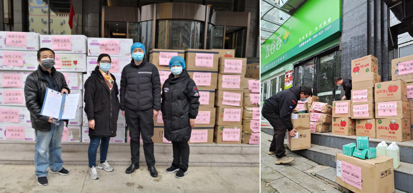3月2日,湘雅三医院援助武汉医疗队向武昌慈善总会捐赠一批物资,用于武汉市新型冠状病毒感染的肺炎疫情防控。物资包括纸尿裤、牛奶、电暖宝、苹果等生活用品。