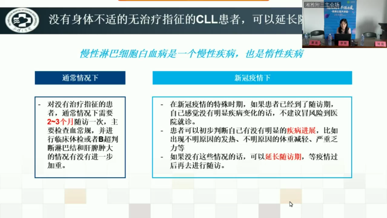 刘竞教授主持并致辞,对上线的患者及家属表示欢迎。他强调,湘雅三医院面对疫情积极响应,虽然目前情况有所好转,但仍然不能松懈,因此希望通过本次直播课堂解决目前淋巴瘤患者诊疗难题,给予患者更切实的指导与治疗。
