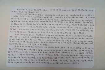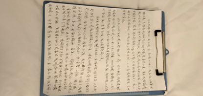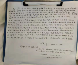 我们的治疗工作有条不紊的进行,“粉红爷爷”的状态也越来越好,能下床活动了。但让他念念不忘的是同在我院治疗的他的儿子的情况,由于将近一个月没有看见家人,他的心里充满了思念和关心。关爱新冠肺炎患者的心理健康,也是我们的治疗方向之一,每次查完房,我们都愿意和他多聊一会儿,帮他排遣心里的压抑。我们病房的护理老师也都自愿成为患者的临时家属, “一对一”帮助那些被病毒隔离的重症患者,为他们排忧解难,进行心理辅导。黄哲是“粉红爷爷”的临时家属,在与他的每天互动中,“粉红爷爷”很感动,他动情的说到:“为了帮助我们,你们冒着被感染的风险,来武汉照顾我们,还把我们当亲人一样对待,真的很感谢你们,为你们的勇敢点赞。”由于传来了他儿子即将出院的好消息,他经不住感慨,写下了第二封感谢信。