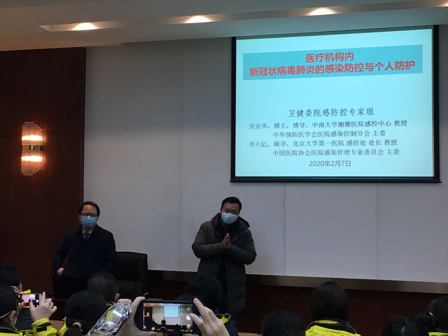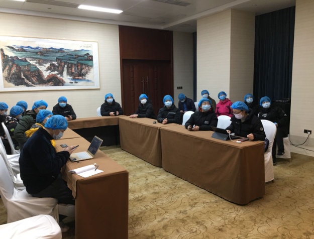 2月8日元宵节,带着医院和学校领导的祝福和期待,带着家人和朋友的关切和叮嘱,带着满满一节车厢的各种物资,医疗队于15:38准时出发离开长沙,于17:04达到武汉站。初到武汉,天空凝重,空无一人,大家默默的搬运行李和物资,没有过多的交流。来到驻地,诺大的酒店,没有几个工作人员,只有我们医疗队的130个队员。安顿完毕,医疗队队长带领医疗组专家立即对各项工作进行了紧急部署,连夜制定了医疗队驻地院感防控流程和措施。2月9日,在酒店驻地,湘雅医院吴安华教授以及湘雅三医院专家刘纯教授给所有队员再次培训,确保我们用最专业的知识救治与护理患者,用最安全的措施保护自己。