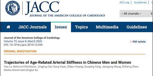 2020年3月,以陆瑶博士为首的中南大学湘雅三医院血管健康青年研究团队在袁洪教授、陈志恒主任带领下,以第一作者及第一完成单位的身份在《美国心脏病学会杂志》(Journal of the American College of Cardiology,JACC,IF=18.639)上发表题为“Trajectories of Age-Related Arterial Stiffness in Chinese Men and Women”的研究论著,并被选为当期JACC封面论文。