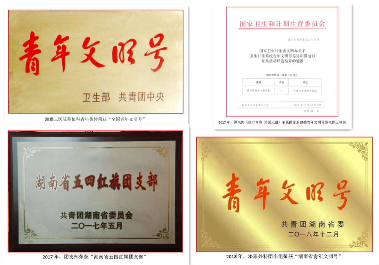 2018年,团支部所辖泌尿外科团小组获评湖南省青年文明号;2017年,团支部荣获湖南省五四红旗团支部称号;同年,微电影《援非青春 大爱无疆》荣获国家卫健委文明办青年文明号微电影三等奖。近年来,团支部涌现出全国改善医疗服务示范个人、中国最美援外医疗队提名奖队员、湖南省雷锋式志愿者李守根,全国护患沟通技巧和护士职业礼仪大赛一等奖获得者崔丽娜,湖湘青年英才、美国耶鲁大学访问学者谢建飞,90后抗疫先进个人、“我的同乡英雄”索冉冉等青年先进典型,一批团员、青年获中南大学优秀团员、团干、青年岗位能手等荣誉。团支部构筑青春堡垒,积极投身疫情防控,为建设“健康中国”贡献了新湘雅外科青春力量。