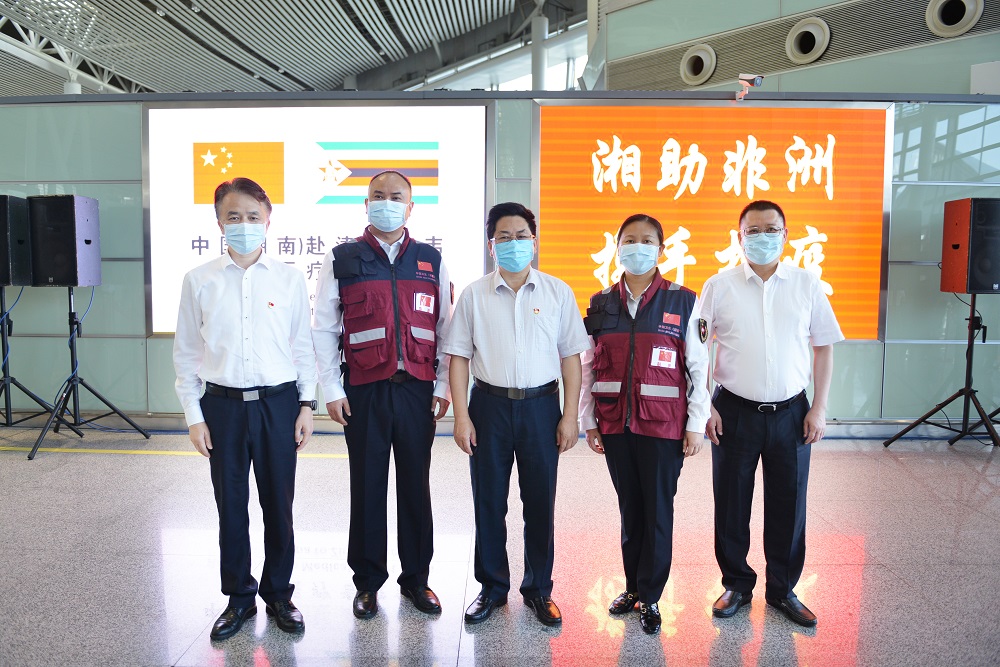 中共湖南省委领导为专家组送行,省政府副省长吴桂英向专家组授旗。中南大学党委常委、副校长陈立章,中南大学湘雅三医院党委书记何庆南、院长张国刚也早早来到机场为队员送行,并嘱托两位队员要做好防护、确保安全,早日平安归来。