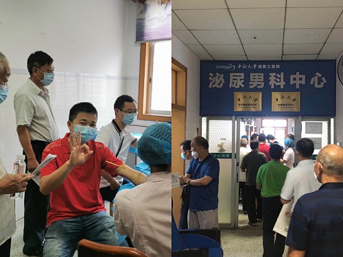 本次活动主要分为三个环节:免费前列腺特异性抗原(PSA)抽血筛查及尿流率检测、专家义诊和前列腺疾病知识讲座。早上7点30分,就有许多朋友自觉地排起了长龙,湘雅三医院泌尿外科的专家教授们和工作人员也提前到达了义诊现场。