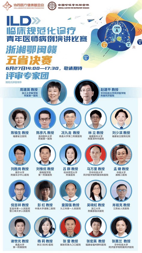 本次比赛以线上会议形式进行,由浙江大学医学院附属第一医院周建英教授和华中科技大学同济医学院附属同济医院赵建平教授主持,来自五省一流医院的22位呼吸病专家作为评委进行评分,中南大学湘雅三医院呼吸内科孟婕教授作为特邀点评嘉宾出席。