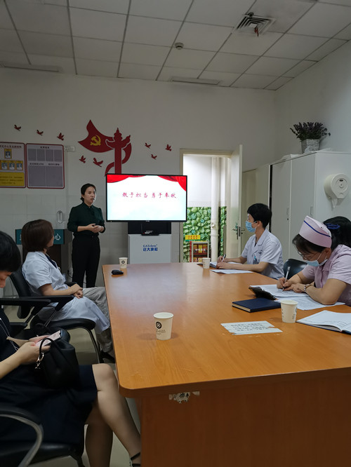 作为有着13年工作经验的老护士,同时也是医院应急护士队员的肾内科护士周钰琼分享了主题为“敢于担当,勇于奉献”的报告。她回想到疫情爆发初期,院党委开始组织自愿报名,她第一时间就和家人商量要去支援。她说:“虽然妈妈也有担忧,但是我既是一名护士,也是一名党员,投入战疫是我的职责,也是我的使命,更是一趟赶赴守护生命之约的旅程”。