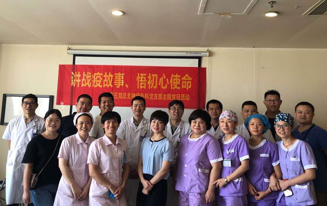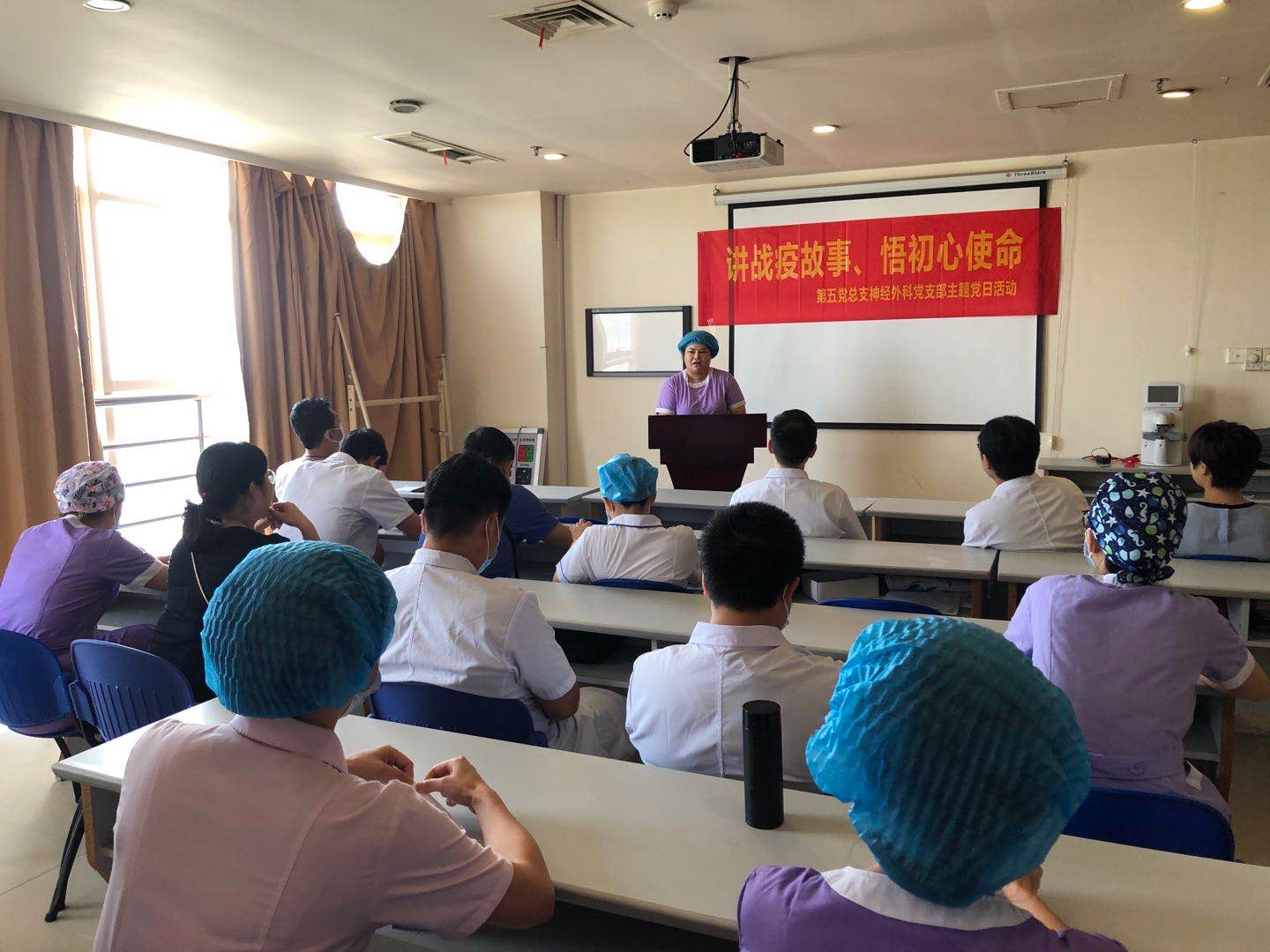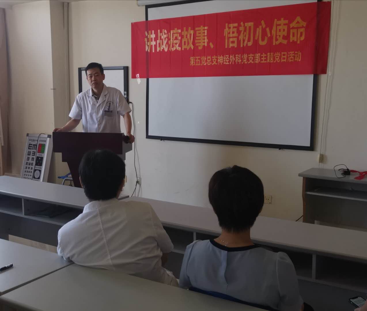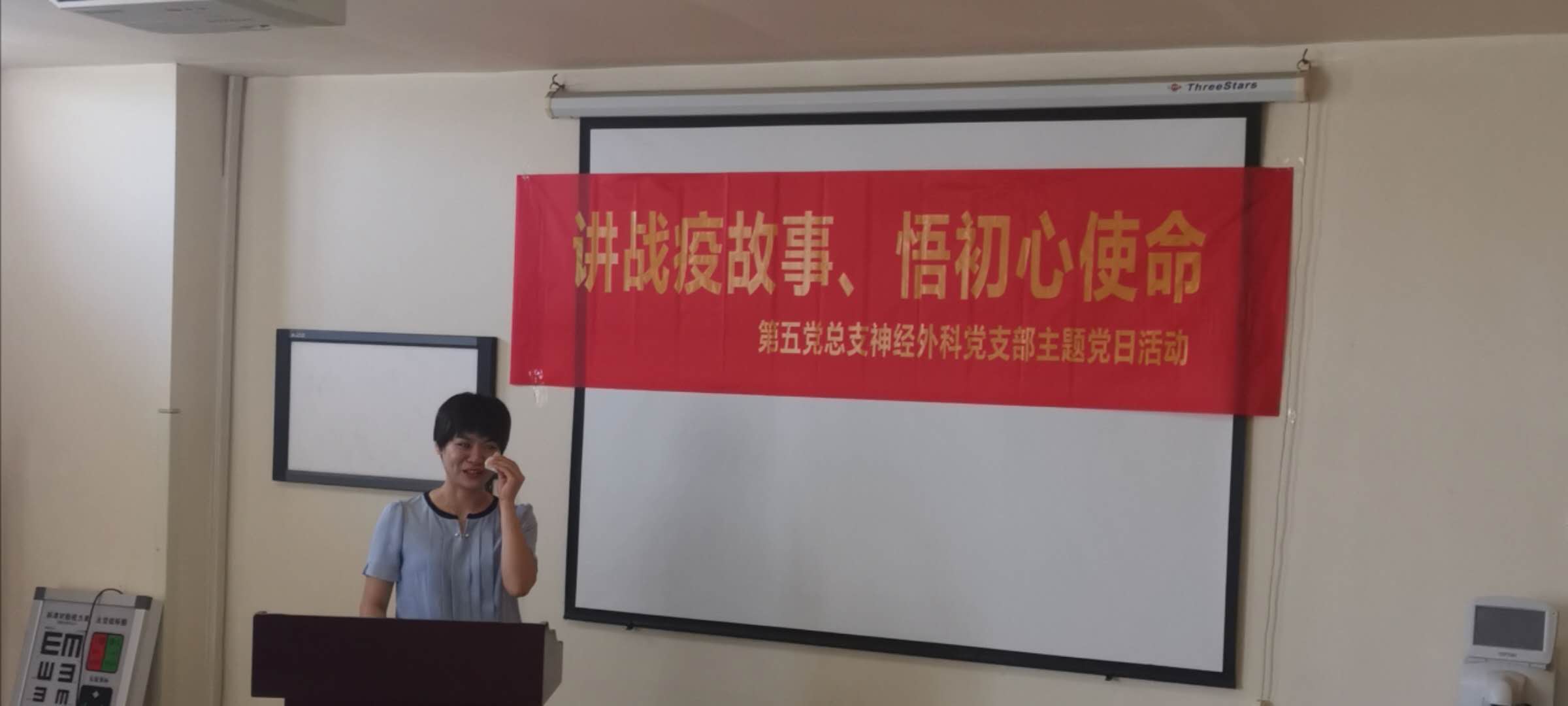 7月15日下午,第五党总支神经外科支部在外科楼9楼示教室开展“迎党的生日、讲战疫故事、悟初心使命”7月主题党日活动。党支部全体党员和部分科室员工参加,党支部书记王知非主持会议。