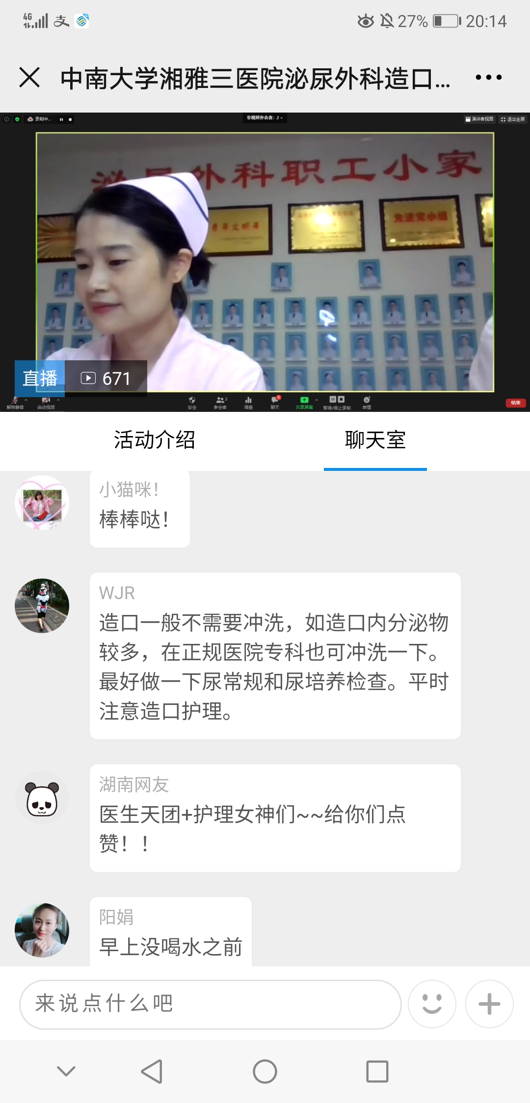 7月16日晚,由中南大学湘雅三医院泌尿外科28病区举办的以“关注造口,为爱发声”为主题的第二届“造口之家”联谊会圆满完成。由于仍处新冠疫情防控期间,所以本次活动采取了线上直播的方式。活动报名邀请函发出后,吸引力了众多泌尿造口病友们,通过和病友们进行电话交流和视频直播教程指导,700余人积极参与了泌尿外科“造口之家”线上直播联谊会。