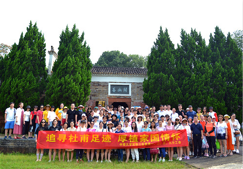 上午,大家心怀对诗圣杜甫的崇拜与敬仰之情,来到了有着“千古名胜,诗圣遗阡”之称的杜甫墓祠,参观杜甫墓、杜文正公祠、杜公祠堂、浣花草堂和铁瓶诗社等极具文物、史学、观赏价值的古建筑群。通过聆听讲解员的详细解说,大家对杜甫三次壮游、十年长安、战乱流离、漂泊西南、客死湘江的人生感触良多。