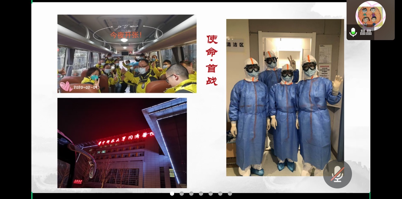 活动中,刘晶晶医生以《武汉回忆》为题,带我们一同回顾了她驰援武汉的心路历程。她说,我是党员,就该到最需要的地方去。早在1月下旬,当她从官方消息了解到武汉新冠肺炎疫情的进展时,她便做好随时奔赴前线的准备。当医院紧急组建援湖北国家医疗队的集结令一响,她立即请战。随后,她用生动的语言和清晰的图片再现了她在武汉重症隔离病房的首战经历以及在风雪中转运患者的故事。