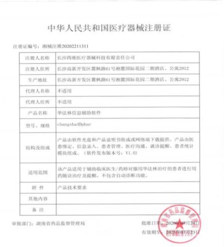7月29日,中南大学湘雅三医院阳国平教授团队开发转让的“华法林个体化治疗决策信息系统”,经长沙四维医疗器械科技有限责任公司后期市场化产品开发的“华法林信息辅助软件”成功获批二类医疗器械注册许可证。