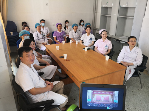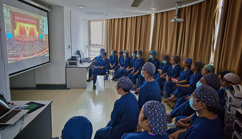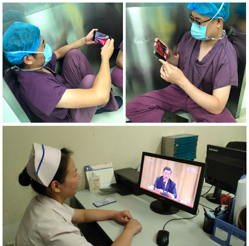 在保证日常医疗工作的同时,第二党总支妇产科医护人员利用手术、治疗休息的间隙,纷纷收看直播。