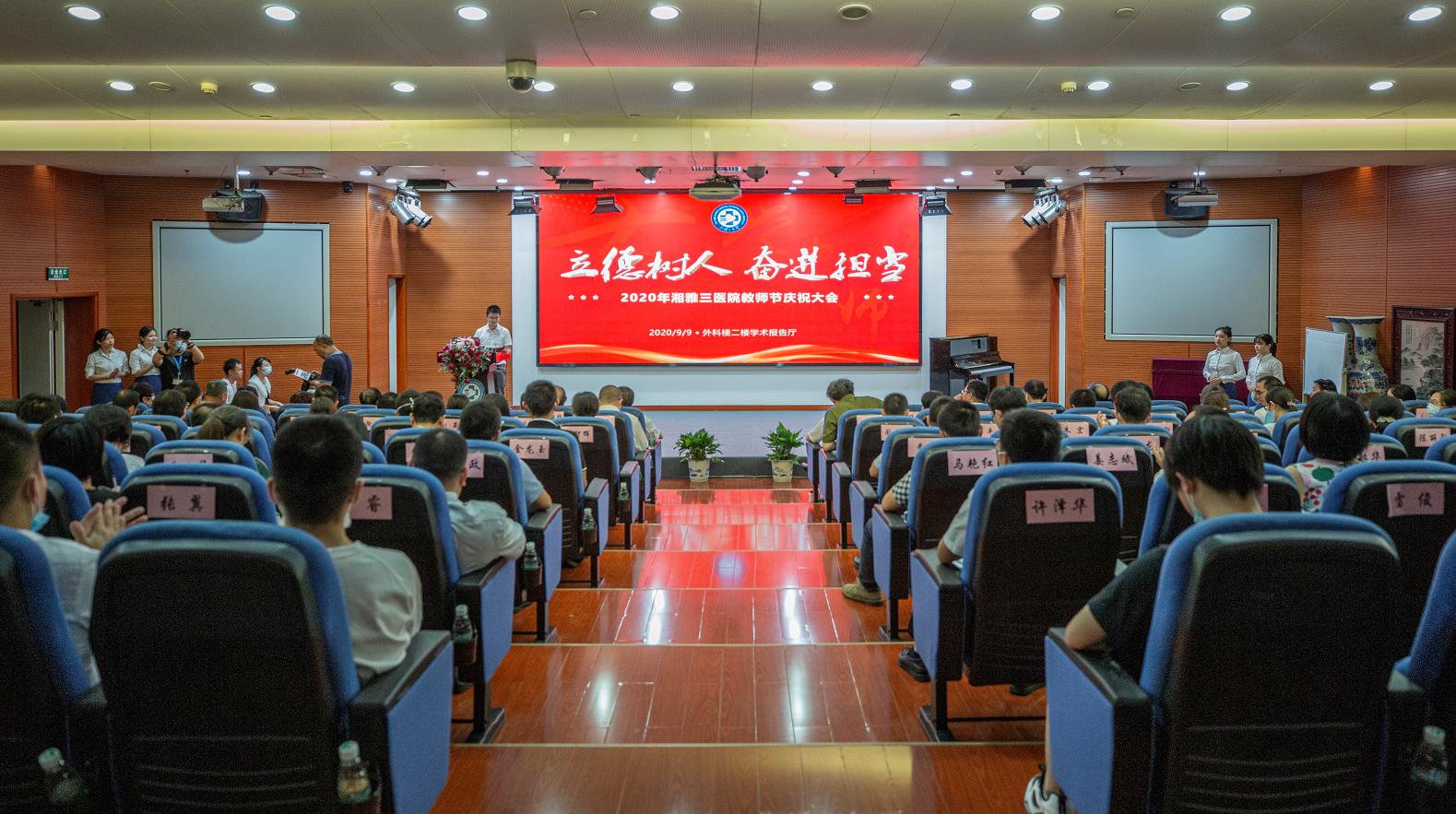 9月9日下午,中南大学湘雅三医院2020年教师节庆祝大会在外科楼2楼学术报告厅举行,大会主题为“立德树人,奋进担当”。医院党委书记何庆南、院长张国刚出席,在院全体院领导、老教授、督导专家代表、各教研室主任、相关职能部门负责人、援鄂医疗队教师代表、骨干青年教师代表和学生代表等100余人参加。党委委员、副院长吕奔主持大会。