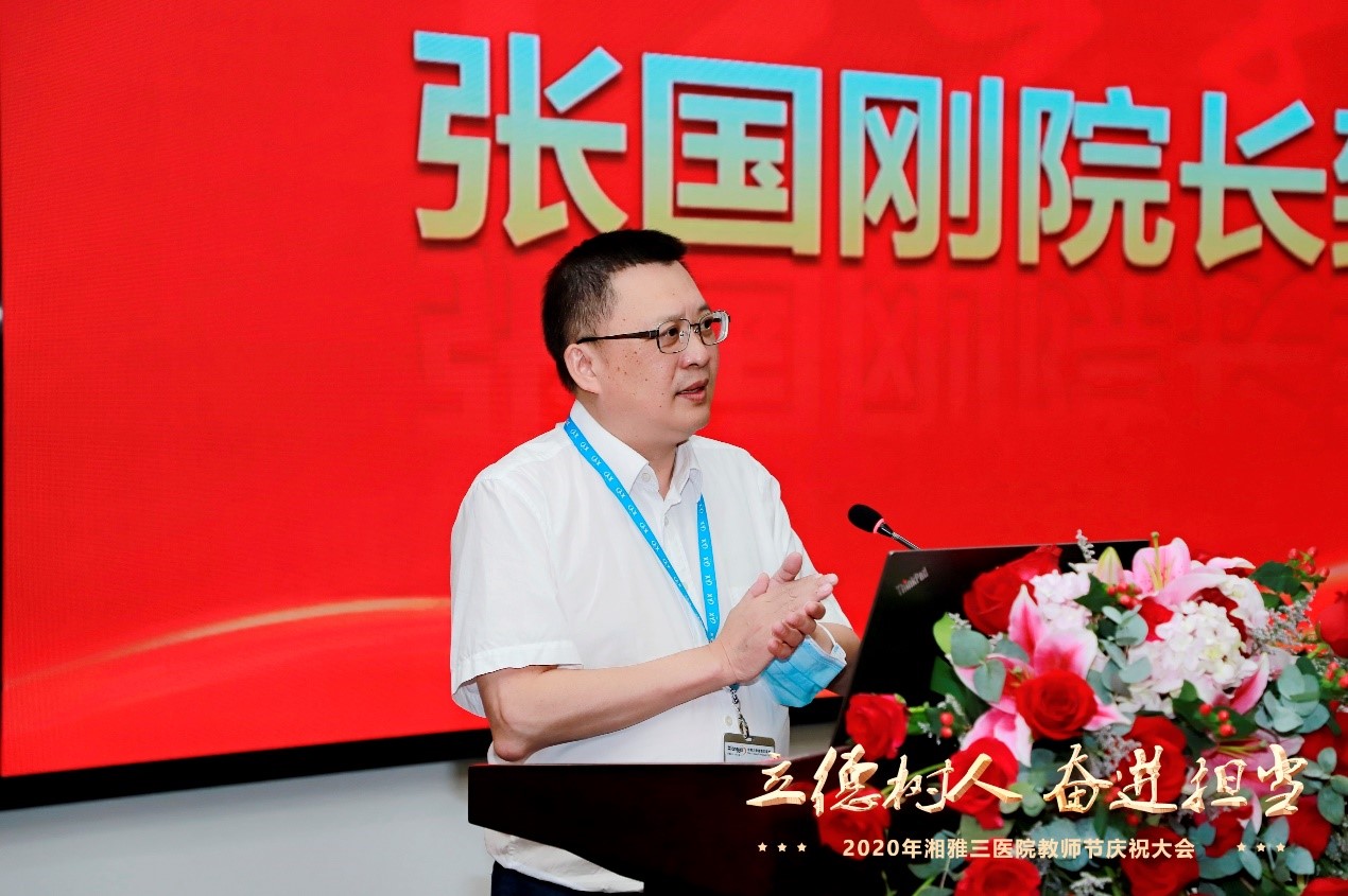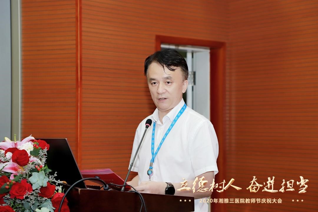 张国刚院长向全体老师送上节日问候。他回顾了湘雅三医院医学教育的发展历程,总结了教学工作取得的标志性成果,他指出,临床教师抗疫与教学两不误,彰显了医者和师者的风范与担当,将“立德树人是教育之本”的核心理念诠释得淋漓尽致。他鼓励广大教师秉承“公勇勤慎、诚爱谦廉,求真求确、必邃必专”的湘雅精神,持续巩固奋进之笔的成效,构建新湘雅尊师重教的文化,培养更多有理想、有担当、有作为的新湘雅人,为推动卫生健康事业发展做出更大的贡献。