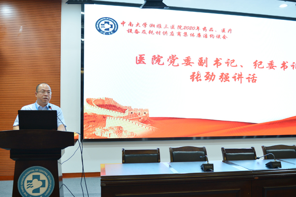 张劲强传达了国家卫生健康委员会等九部委《2020年纠正医药购销领域和医疗服务中不正之风工作要点》、国家卫生健康委《2020年医疗行业作风建设工作专项行动方案》以及国家大型医院巡查等文件精神,重点分析了当前医疗行风动态和国家反腐形势,通报了近期以来医疗领域的违纪违法典型案例,重申了医院《关于严禁医、药、医用材料等供应商在我院工作场所向医务人员进行推销活动的通知》要求。“莫伸手,伸手必被捉。”他给供应商代表上了上“紧箍咒”、敲了敲“醒世钟”:严格落实“九不准”“五不准”以及中南大学“十二不准”,严格行业自律,规范医疗购销行为,守好行风底线,不要心存侥幸,不越雷池一步。他强调,严管就是厚爱,我们要着眼长远,合作共赢未来。
