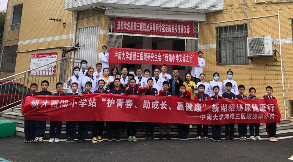 10月30日,中南大学湘雅三医院泌尿外科男性病中心主任龙智副教授、曾青副教授、阳建福副教授、崔丽娜护士长带领科室义诊团队到博才西湖小学,开展新湘雅泌尿健康行公益活动,本次活动也得到了湘雅三医院研究生会的大力支持。活动旨在及时发现学生青春期生殖健康问题,普及青春期健康知识,帮助其更好地掌握新型冠状病毒防控及手卫生相关知识。