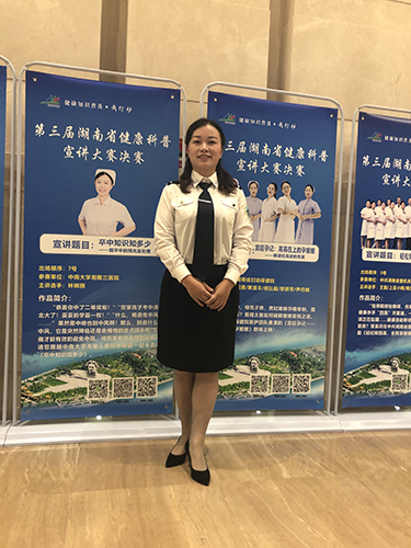 10月29日,林婉丽主管护师参加“健康知识普及·我行动”第三届湖南省健康科普宣讲大赛,以演讲的形式向大众科普,并荣获“优胜奖”。当天下午,脑心健康管理师胡清在科内对患者及家属又进行了一次预防卒中复发的小讲堂。