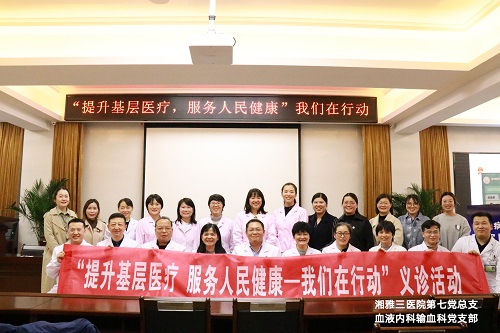 为献礼建党100周年,贯彻落实党的十九大报告提出的“健康中国”基本方略,提升基层医疗卫生服务能力,提升群众满意度。4月10日下午,中南大学湘雅三医院第七党总支血液内科输血科党支部联合中华医学会血液学分会第十一届青年委员会在湘潭市中心医院开展了义诊活动,为广大血液病患者送去了优质的医疗服务。