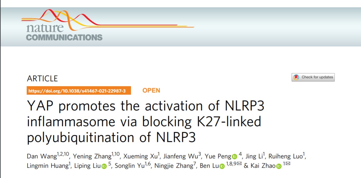 近日,中南大学湘雅三医院吕奔-赵锴团队在国际知名学术期刊《Nature communications》上发表题为“YAP promotes the activation of NLRP3 inflammasome via blocking K27-linked polyubiquitination of NLRP3”的论文,阐述了Hippo信号转录因子YAP调节NLRP3炎性小体活化的分子机制,为脓毒症等疾病的防治提供了新的思路。中南大学湘雅三医院2016级博士研究生王丹和2017级博士研究生张叶宁为共同第一作者;中南大学湘雅三医院吕奔教授和赵锴副研究员为共同通讯作者。