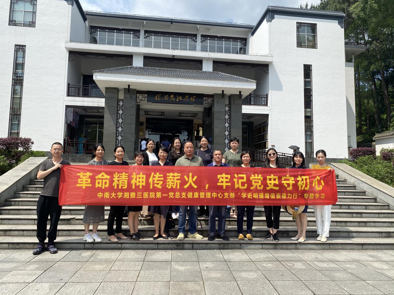 5月15日,中南大学湘雅三医院健康管理中心党支部全体党员前往长沙县杨开慧故居及陈树湘故居开展“学史明理增信崇德力行”专题学习活动。党总支书记罗海波和健康管理中心党支部共15人参加了本次活动。活动旨在积极响应医院党委学史明理、学史增信、学史崇德、学史力行的号召,帮助党员们重温中国共产党的伟大发展历史,引导大家树立正确的爱党、爱国的人生观,价值观。