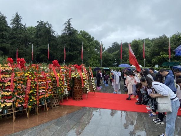 下午2点,全体成员来到韶山毛泽东铜像广场。尽管天空下起了蒙蒙细雨,但前来瞻仰参观、缅怀先烈的游客仍络绎不绝。刘典书记以及四位学生代表带领第十一党总支全体党员向毛泽东铜像敬献花篮,以沉重的心情缅怀先人,让全体党员再一次接受深刻的党性教育,更加认识到作为一名共产党员所担负的使命和责任。