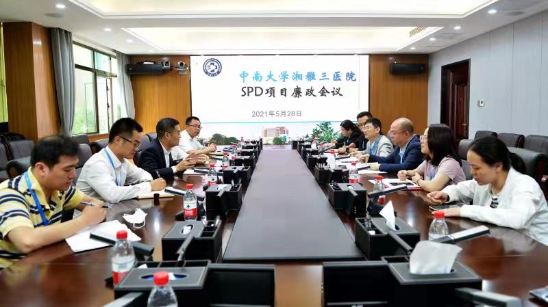 5月28日上午,中南大学湘雅三医院纪委在综合楼一会议室召开医用耗材供应链管理(SPD)项目廉政会议。医院党委副书记、纪委书记张劲强出席会议并讲话,医院纪委副书记监察办主任万响、纪委副书记何君、医学装备办主任彭伟莲、信息网络中心主任王安莉、医疗保障中心副主任谭焱、医学装备部副主任袁博纯、纪检专干段灏以及湖南德荣医疗器械物流配送服务有限公司董事长郭德斌、高级副总裁张卫、SPD事业部总监陈翀、运营总监周克明参加会议。
