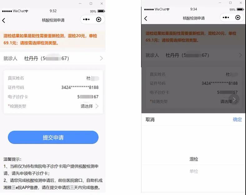为方便患者前来核酸检测,湘雅三医院微信小程序开通“核酸检测申请”功能,快速开单、及时缴费功能,并提供混检、单检两种选择,让患者根据自己需求实时完成核酸检测。