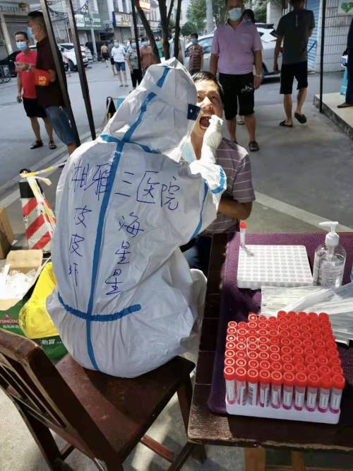 余晓老师在每个采集点进行巡查,及时观察队员们有无不适,不允许我们硬撑。与志愿者的工作配合默契后,采集进度加快很多,贴身的衣服早已被汗水浸得透湿,背靠着社区人员送来的冰块,背上一丝凉,心却无比暖。夜深至凌晨,一日的采集工作才结束,疲惫不堪的队员们脱下防护服,已是汗珠密布,双手泡白,没有一丝怨言,满是成就。每段青春都会老去,但我们的记忆里会永远为这段抗疫经历留下一个位置。希望这辛劳与付出,能给张家界筑起一道道抗击疫情的坚实防线。