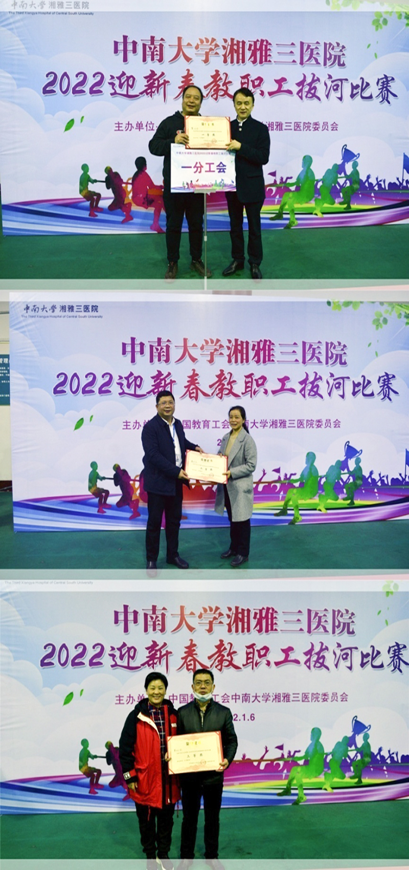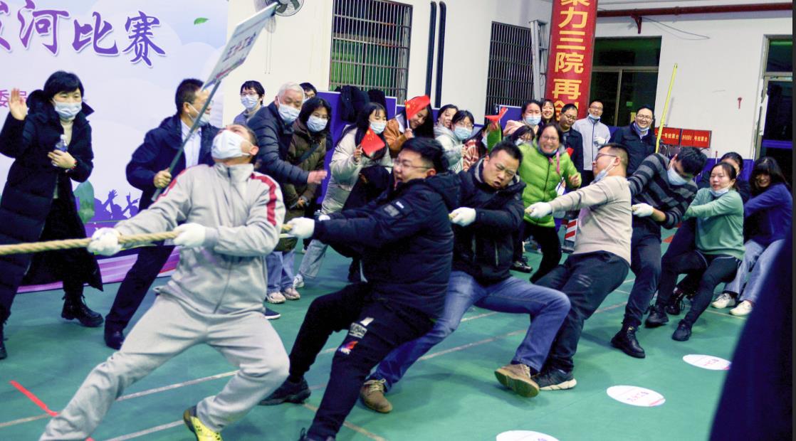 为深入贯彻落实全民健身计划,为丰富教职工的文体生活,增强集体荣誉感和凝聚力,1月6日下午,湘雅三医院举行“2022迎新春教职工拔河比赛”,十个分工会共300余名教职工参加。医院全体在院院领导出席了开幕式。
