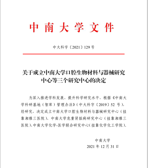 1月7日,中南大学湘雅三医院肾病风湿病科收到中南大学《关于成立中南大学口腔生物材料与器械研究中心等三个研究中心的决定》文件,新成立的中南大学危重症肾脏病研究中心挂靠湘雅三医院。