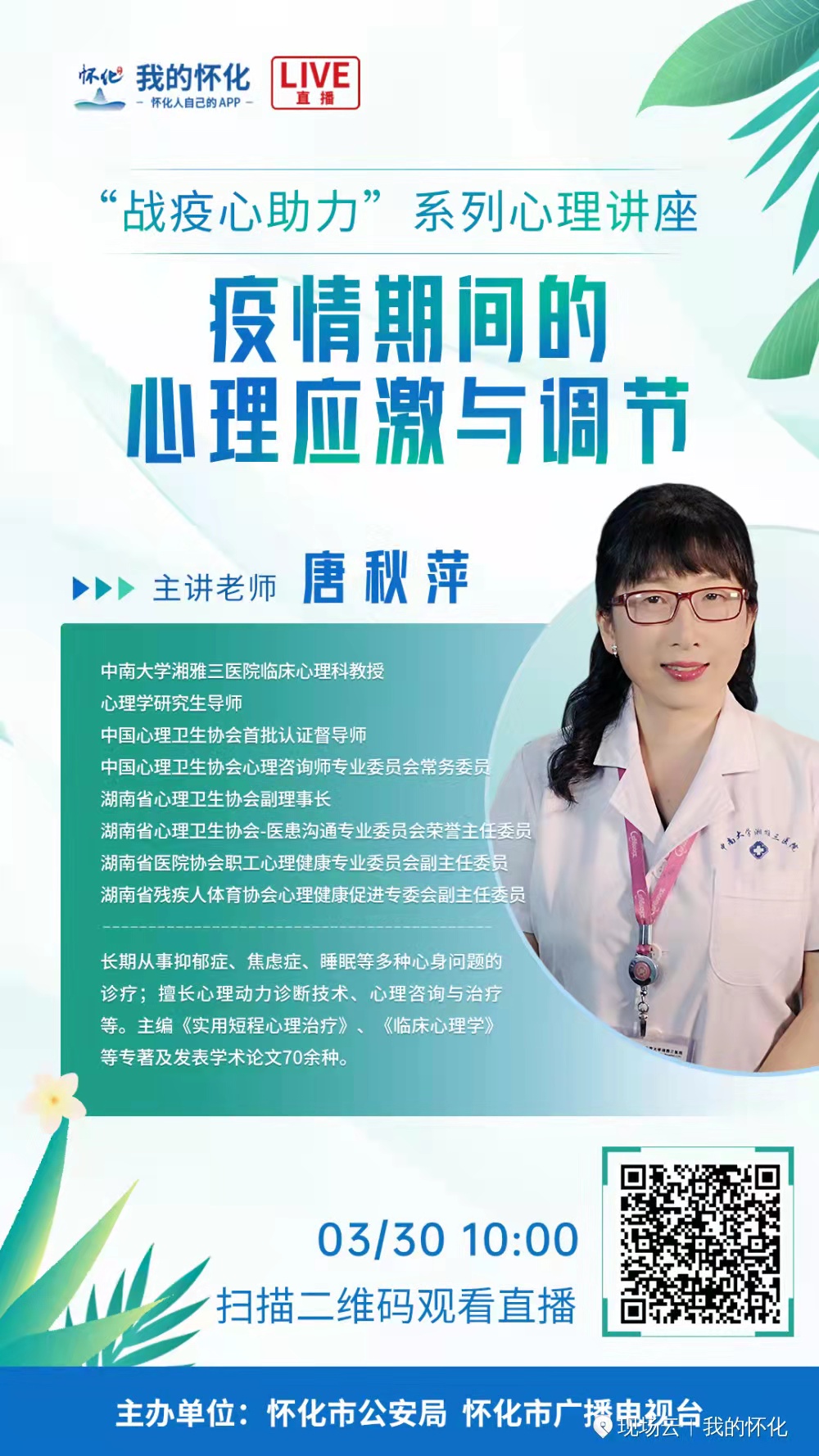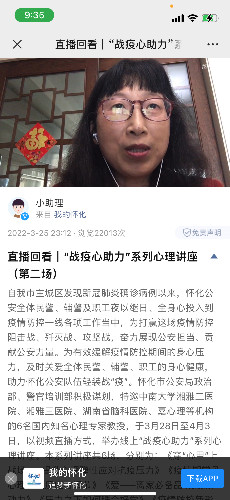 3月30日上午,怀化市公安局政治部、警官培训部邀请中南大学湘雅三医院临床心理科主任唐秋萍教授以视频直播方式开展线上“疫情期常见心理应激反应与调节”讲座。此次讲座为怀化市公安局政治部、警官培训部策划的“战疫心助力”系列讲座之一,旨在有效缓解疫情防控期间公安队伍的身心压力、及时关爱身心健康,有万名以上民警、辅警等公安系统工作人员参与。