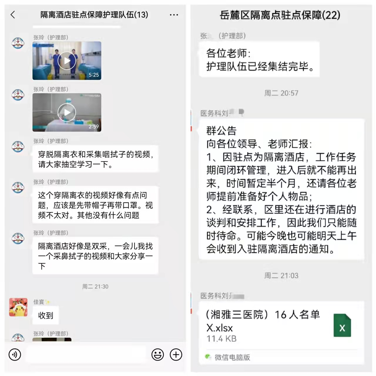 隔离对象和医务团队每天需要进行鼻咽及口咽核酸采样,鼻咽采样受检者不适感更明显,尤其是患有鼻部过敏和鼻息肉的人会感到更加难受。团队中作为耳鼻喉科医生的陈潇雅,给大家普及了取样的一些特别注意事项以及如何轻巧地留取鼻拭子,减少不适症状,并且督促大家相互取样练习,交流感受和需要改进的地方。付出努力的收获明显,改进采样技巧后,团队收到了更多隔离对象的表扬和赞许。自驻守酒店以来,陈潇雅医生公开自己的电话号码,并保持24小时电话畅通,方便隔离人员有问题时及时联系。并且,她悉心问诊有基础疾病的隔离人员,了解既往病史和目前服药情况,确保他们随身带有药品,并指导用药,受到隔离对象一致好评。此外,团队还要关注隔离对象在微信群里的聊天记录,随时为隔离人员排忧解难。微信群里甲状腺癌术后的隔离对象询问优甲乐如何吃、吃多少的问题,陈潇雅医生专业又细心地回答问题、耐心指导。这些举动,无不展现了湘雅三医院人的专业技能和人文情怀。