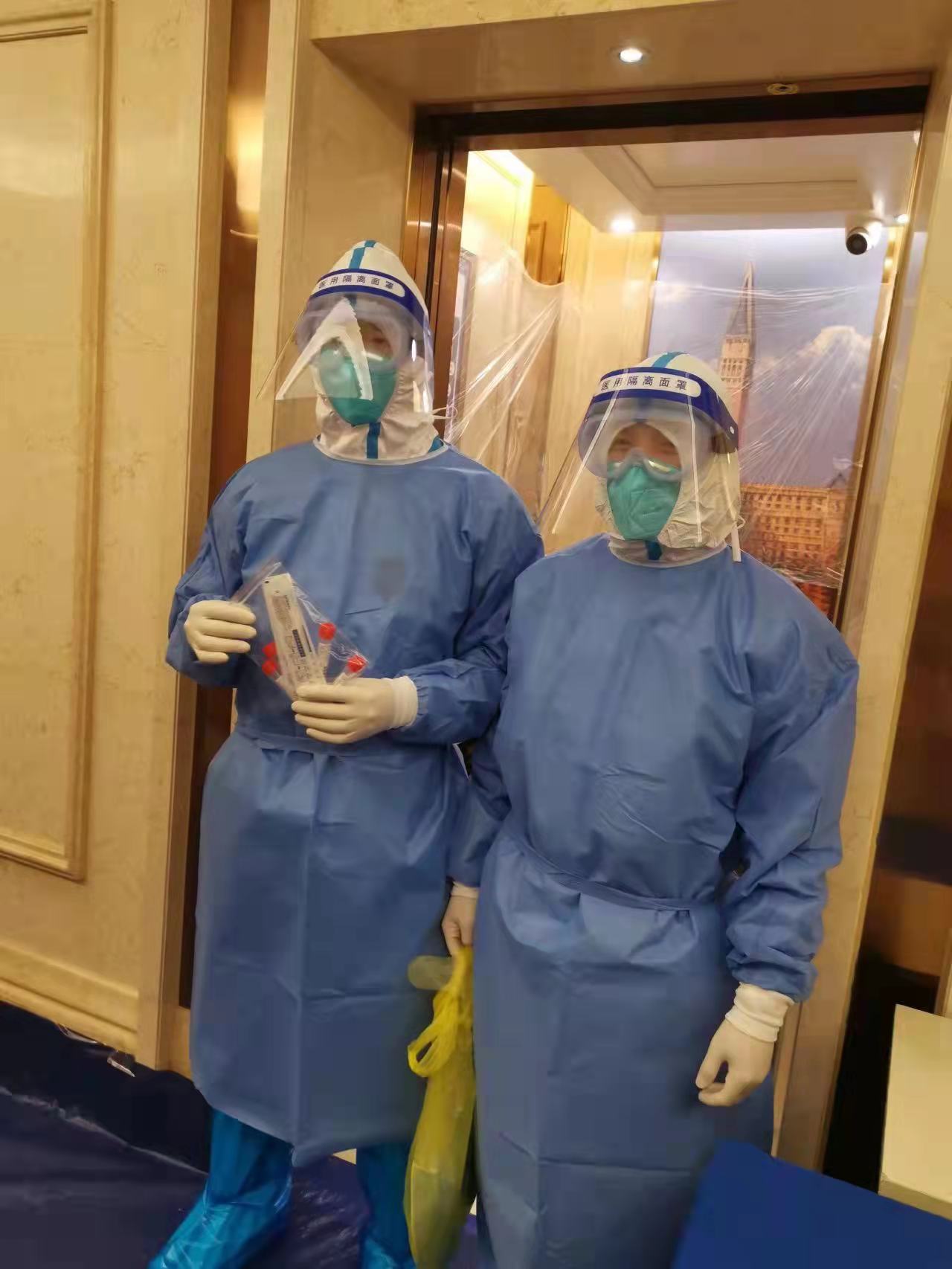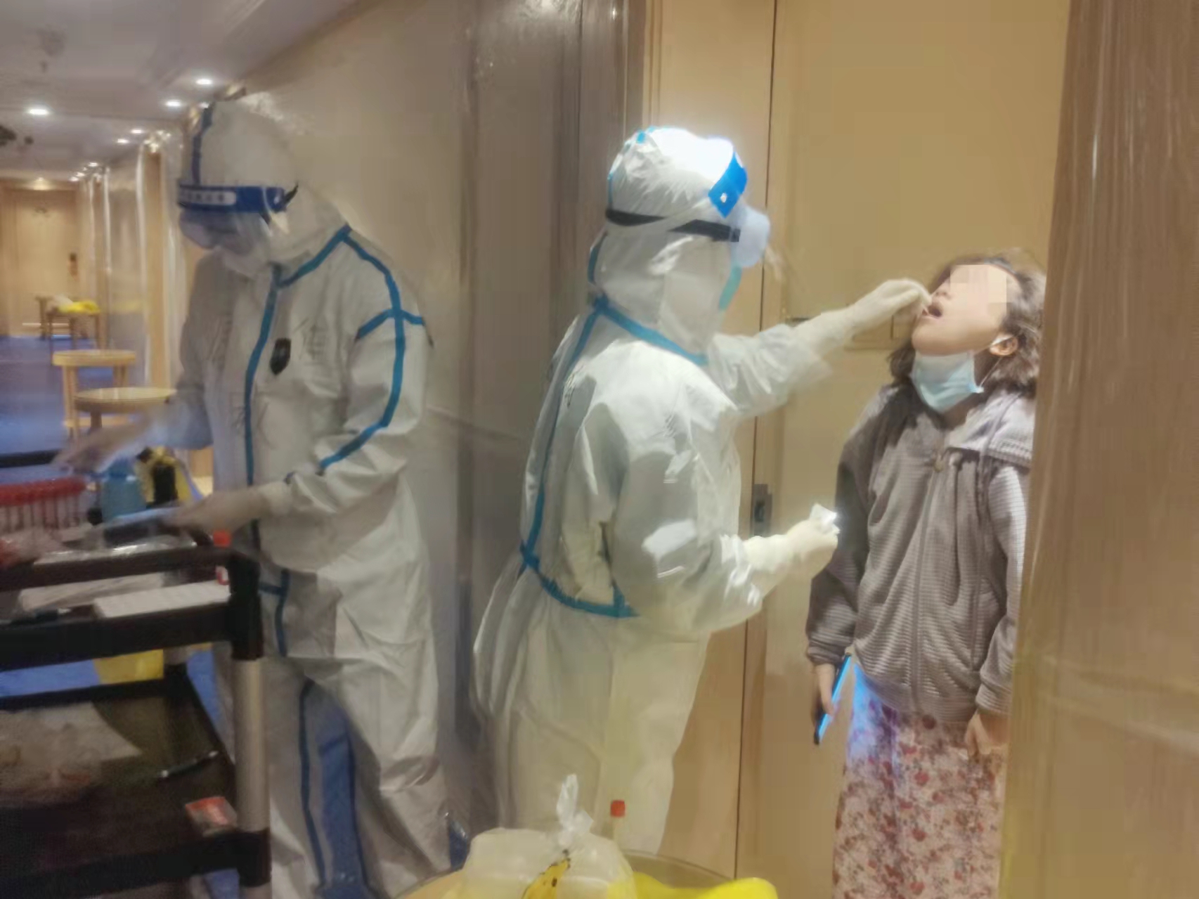 医疗保障团队的陈潇雅医生、康佳威护士和杨云宁护士,被分配在维也纳(岳麓山滨江大学城店)隔离酒店。晚上初到隔离酒店便得知第二天上午就要接收密接和次密接的隔离对象,然而酒店疫情防控布置尚未开始。三人当即与湖南省肿瘤医院医疗团队就如何对酒店进行管理、如何分工合作等事项进行了探讨,随后争分夺秒投入准备工作。从环境的消杀、标本采集流程的梳理、三区两通道的建立到各应急预案的演练,三人紧密协作,忙而不乱。团队中杨云宁同志是队伍中年龄最小的成员,她总是跑在前面,抢着干活,似乎有使不完的力气。事后才知道,她当天差点虚脱,队员的积极主动的状态不断地激励着大家。当天任务完毕,湘雅三医院医疗团队得到了市卫健委监督执局的高度肯定,各级领导纷纷赞扬我院医疗队员以速度表决心,用专业展姿态。
