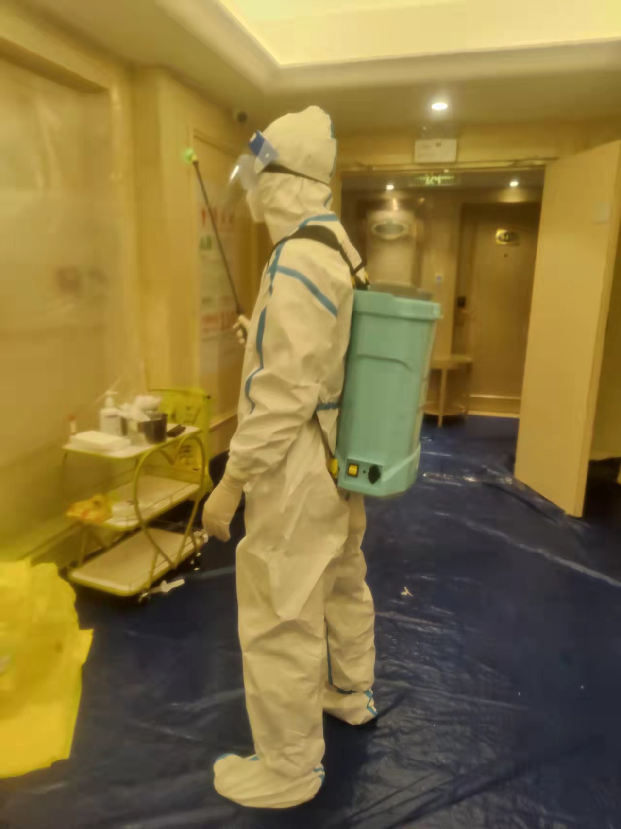 4月1日22:55分,在隔离人员中发现一名隔离对象体温高达39°C,核酸检测也有异常。团队立即上报,接疾控中心通知并转运该隔离对象。大家紧急集合,有参加过援鄂经验的康佳威护士率先站出来,他表示自己作为一名共产党员,又是男生力气大,消毒工具扛的动,而且援鄂的时候有过这方面的经验,理应冲在前面,他主动承担起转运、消毒等一系列工作。这些举动,体现了湘雅三医院人勇于迎接挑战,敢于战胜困难,使命必担的情怀。