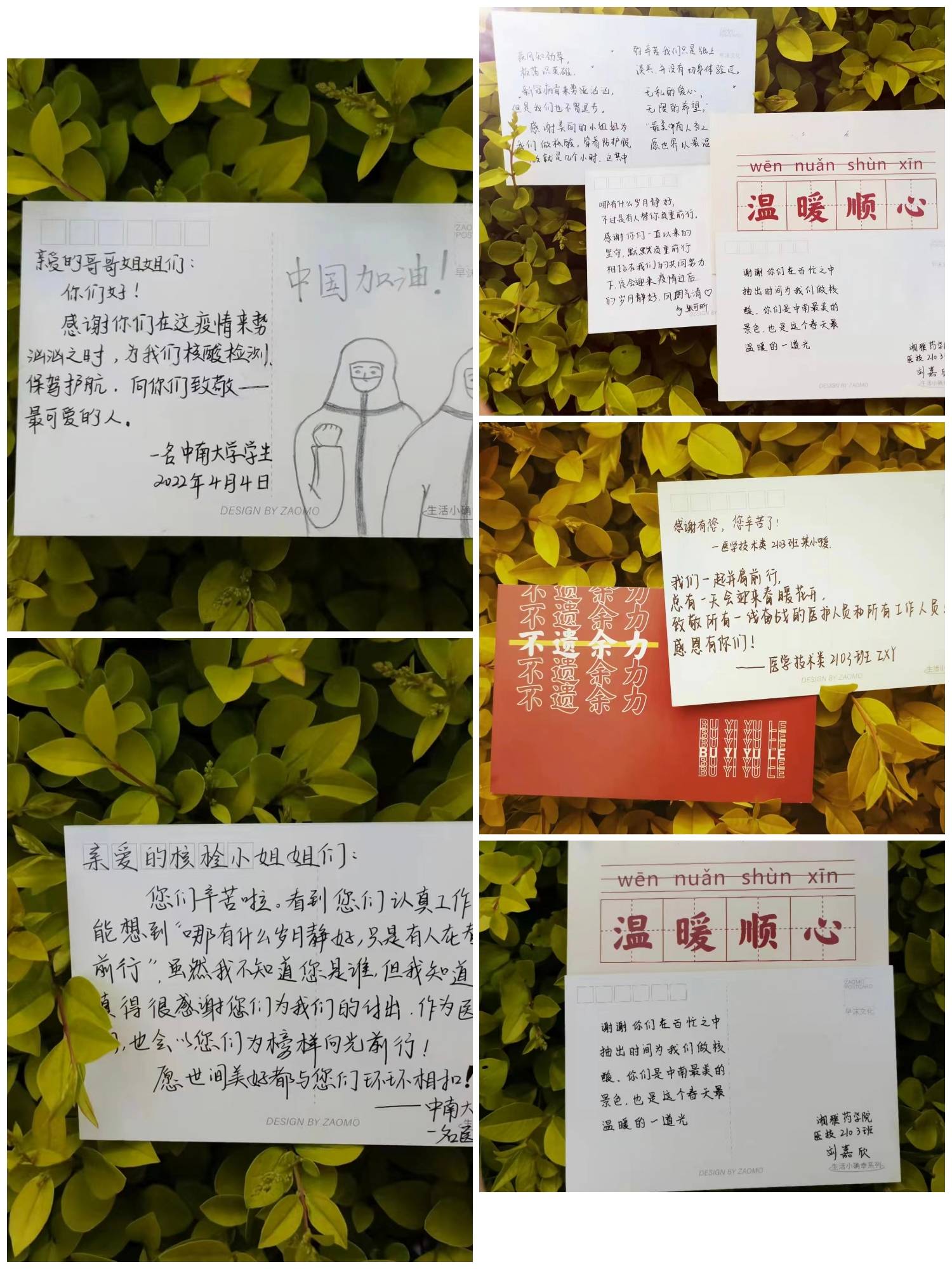 “白衣天使们,你们辛苦了……”“你们是最可爱的人……”“谢谢,辛苦啦!”在核酸采样现场,有的同学掏出准备好的绘画作品或者明信片或一句暖心的话,纷纷用自己的方式表达对大白们的谢意。一幕幕温情,温暖着大白们的心,扫除了一天的疲惫。