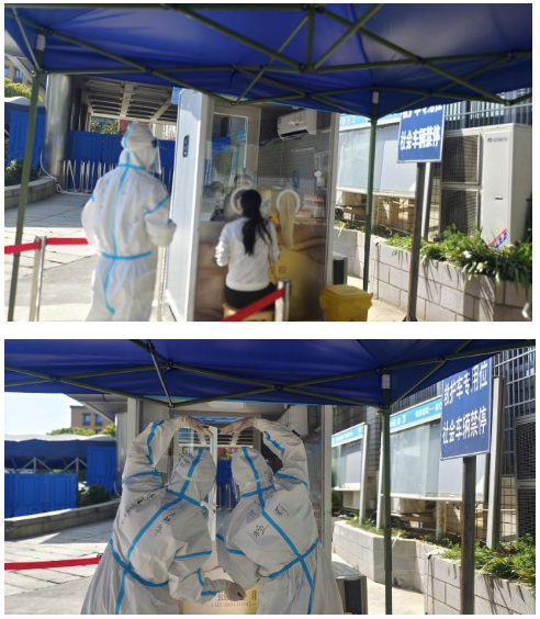 进入湖大后,在医院的统一安排下,健康管理中心八名队员分派至各个区域进行核酸采集。作为援张的抗疫老兵,杨斌芳主动请缨与林芝、石亚芬进入红码区采集。在红码区,为最大限度的防止疫情扩散,队员需要每日多次徒步往返7层红码楼区上门采集,长长的楼道,绑在腰间的医疗废物收集袋在密闭防护服的加持下,似乎都变成了一座大山,汗流浃背,憋闷心慌,实在不行就停下来歇歇再干,即使工作到凌晨,却没有任何一个人抱怨或退缩。黃码区和绿码区虽然风险相对低一点,但任务量大,队员们争分夺秒、废寝忘食,无数次弯腰、下蹲、抬手、采样、消毒......他们有人腰都累得直不起来,有人手上的旧伤复发,锥心地痛,但没有人叫苦也没有人喊停,5天的高强度工作保证了本次核酸检测任务的圆满完成。他们既打了一场漂亮的抗疫战,也给广大师生吃下了“定心丸”。