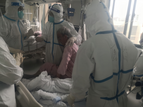 在查房过程中,专家们都亲历亲为,查看呼吸机,了解呼吸力学参数,了解血流动力学参数。对于神智清楚的患者,更是搀扶帮助他下床坐在轮椅上,并且联好视频,让老人家和家里人进行有效沟通,缓解焦虑的感情,他们的每一处细节都无时无刻不在履行着我们重症人对于重症患者治疗的理念:早期下床活动,家庭成员参与。随后,查房还在继续,虽然我还想继续学习,但是防护时间已经到了极限,只能依依不舍的离开,也期待下一次难忘的早交班。