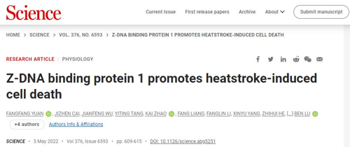 2022年05月05日,中南大学湘雅三医院吕奔教授团队在国际学术期刊Science上在线发表Research Article,题为“Z-DNA binding protein 1 promotes heatstroke-induced cell death”,揭示了热射病的重要致死机理——高体温通过ZBP1蛋白诱发过度的程序性细胞死亡,进而导致弥散性血管内凝血(DIC)与多脏器损伤。该论文的第一单位为中南大学湘雅三医院。中南大学湘雅三医院袁芳芳博士后为第一作者,吕奔教授为通讯作者。