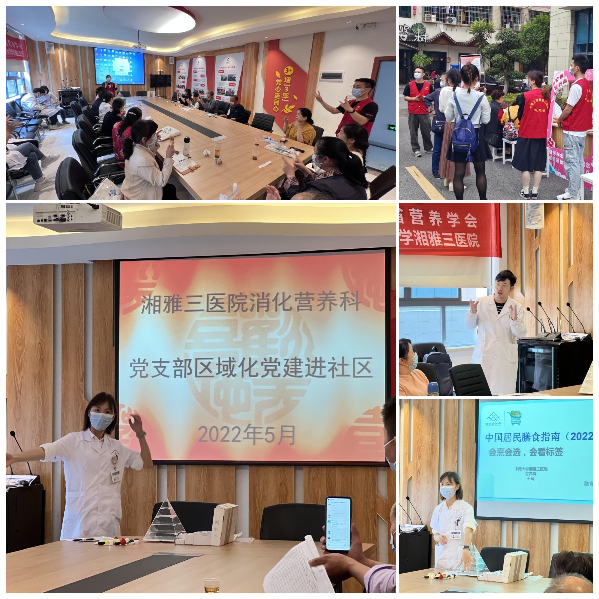 2022年5月15-21日是一年一度的“全民营养周”。今年的传播主题是“会烹会选,会看标签”,口号是“健康中国,营养先行”、“膳食新指南 健康常相伴”。中南大学湘雅三医院营养科在医院党委、团委、医务社工等各部门的大力支持与配合下,举行了一系列公益健康活动,并取得圆满成功。本次公益健康系列活动分为两个部分,第一部分是线上免费宣教活动,第二部分是区域化党建下社区志愿服务义诊活动。