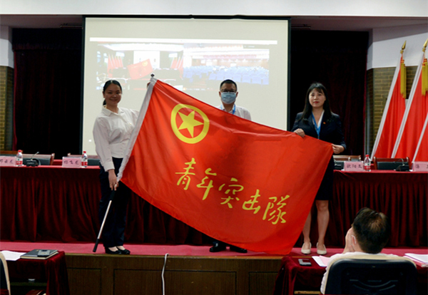 院长张国刚为获得“优秀青年突击队”荣誉称号的青年集体代表——援安阳和长春核酸检测队队长吴苑授旗。青年突击队是以青年人为骨干和主体,在“急、难、险、重、新”任务面前挺身而出、攻坚克难的青年团队。今年的五四评优中,评选表彰了10支疫情防控优秀青年突击队,包括中国(湖南)第22批援塞拉利昂医疗队、湘雅三医院支援张家界核酸采样队、湘雅三医院支援河南安阳核酸检测队、湘雅三医院支援吉林长春核酸检测队等。