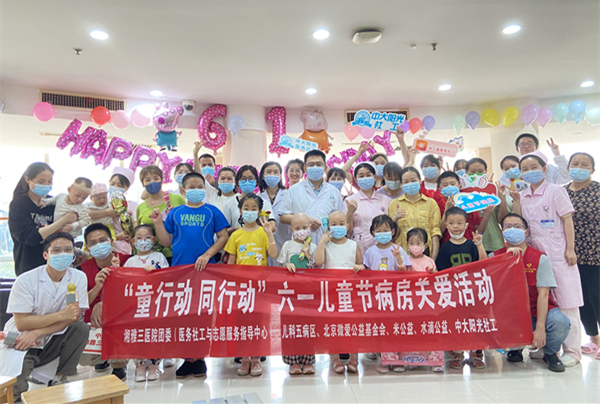 儿童节是每一个孩子最期待的节日,然而病房里有一群特殊的孩子,因为生病住院只能禁锢在病床那块小天地。为了让病房的患儿们也度过一个快乐而又难忘的六一儿童节,5月31日,中南大学湘雅三医院团委、医务社工与志愿服务指导中心联合儿科五病区及北京微爱公益基金会、米公益、水滴公益、中大阳光社工服务中心、湖南雅医医务社工中心等公益伙伴开展了“童行动 同行动”六一儿童节病房关爱系列活动。院团委书记程海威,儿科主任杨明华,儿科护士长蔡骞,特邀表演嘉宾、骨科医师石坚,团委专干戴萍萍,部分医护人员、驻点医务社工、爱心志愿者和病房患儿及家属等七十余人参加活动。
