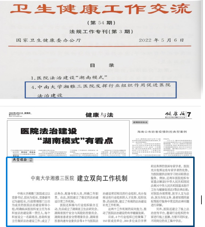 4月《健康报》第七版刊载《中南大学湘雅三医院建立双向工作机制》文章,着重介绍医院建立“内部强化管理,外部整合资源”双向法治建设工作特色机制。5月国家卫生健康委办公厅《法规工作专刊》第3期介绍《中南大学湘雅三医院发挥行业组织作用促进医院法治建设》情况,从双向工作机制“立起来”、学法普法“活起来”、医患关系“亲起来”、法治管理“串起来”四个方面对医院法治建设“新湘雅”模式进行典型推介。