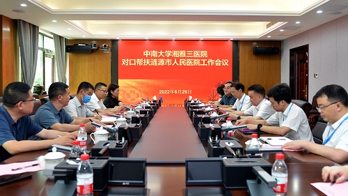 6月29日下午,中南大学湘雅三医院对口帮扶涟源市人民医院工作会议在医院召开。涟源市卫生健康局党组书记、局长王历军,市人民医院党委书记梁志和,市人民医院党委副书记、副院长彭炳辉及县人民医院相关职能部门负责人等一行到访。医院党委书记何庆南,党委委员、副院长欧阳文及相关职能部门负责人参加,医务部副主任刘作良主持会议。