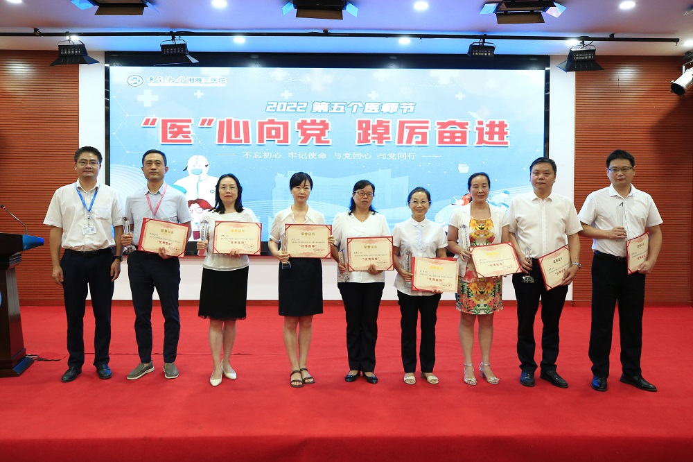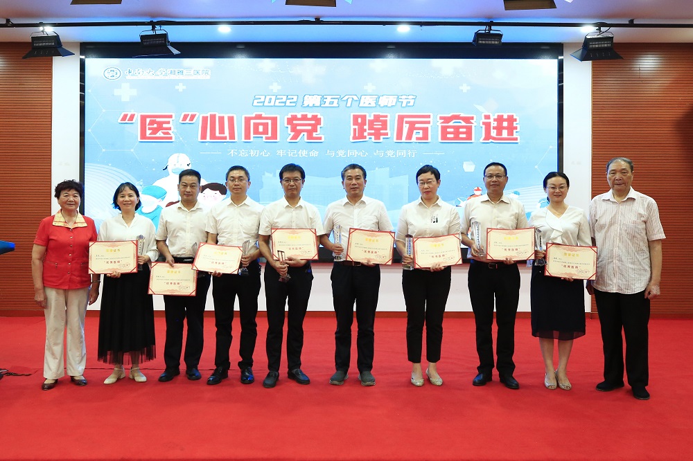 8月18日下午,中南大学湘雅三医院在外科楼二楼学术报告厅隆重举行医院第五届“中国医师节”表彰大会及系列活动,并向院内、院外同步在线直播。中南大学党委常委、副校长陈立章,中南大学医院管理处处长吕奔出席会议,医院院领导、受表彰医师、各党总支书记、离退休医师代表、临床科室负责人代表、职能部门负责人代表、学生代表参会,会议由医院党委委员、副院长欧阳文主持。活动旨在致敬8月19日第五个中国医师节,宣传“‘医’心向党、踔厉奋进”的节日主题,弘扬“敬佑生命、救死扶伤、甘于奉献、大爱无疆”的崇高精神。