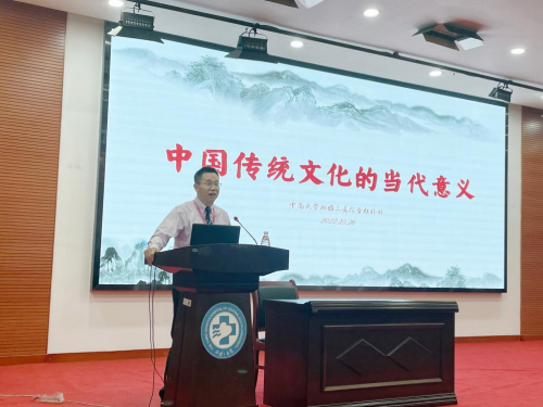 10月26日下午,中南大学湘雅三医院脊柱外科康复科党支部主办的科室文化建设系列讲座之《中国传统文化的当代意义》在外科楼二楼学术报告厅顺利举行。本次讲座特邀中南大学文学院教授、中国作家协会会员、湖南省作家协会副主席阎真教授主讲,由脊柱外科主任邓幼文教授主持。医院党办主任许泽华、党委宣传部主任李姗、第五党总支部书记余希、院团委书记程海威、护理部主任严谨受邀出席,来自各临床科室的医护人员、研究生等逾100人参会,共同开启了一场文化复兴与现代思维相碰撞的文化盛宴。