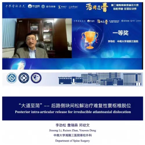 此次大赛旨在提高广大青年医生临床技能,完善诊疗思路,创造更多临床交流机会,通过省级、大区、全国赛层层选拔,最终来自全国知名三甲医院(包括四川大学华西医院、河南省人民医院,山东省立医院等)的10位选手进入总决赛。在脊柱外科主任邓幼文指导下,李劲松以《大道至简——经侧块间隙松解治疗难复性寰枢椎脱位》为题展开精彩演讲,通过临床病例提出难复性寰枢椎脱位的临床难点与痛点,紧跟国内外颅椎外科新技术的发展与创新,展示了新湘雅脊柱外科团队在这一领域攻坚克难的新技术新方法。娓娓道来的演讲风格、精美的幻灯制作和完备的随访资料,打动了在场所有评委,获得一致认可与赞扬。经过紧张激烈的角逐,李劲松医生获得本次大赛的全国总冠军。