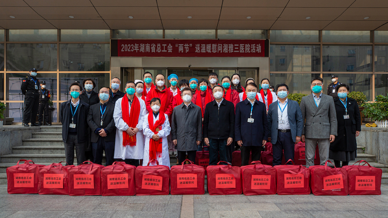1月10日下午,省总工会党组书记、副主席何俊峰一行,在省卫生健康委员会党组成员、省卫生工会主任高纪平,省教育工会副主席易丽鹏的陪同下,来到中南大学湘雅三医院开展“两节”送温暖走访慰问工作,看望了奋战在临床和抗疫一线的王维教授、王知非教授、马熠医生、王卓医生、肖涛科护士长等先进工作者和一线医护人员代表。省总工会和省教育工会相关部门负责同志,院领导何庆南、张劲强、邓云龙、欧阳文、汤英、朱利勇和相关职能部门负责人参加了慰问活动。党委副书记、工会主席杨飞龙主持慰问仪式。