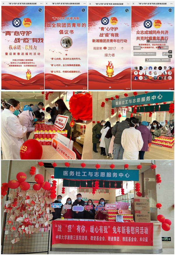 1月16日起,院团委、医务社工与志愿服务指导中心联合北京微爱基金会、朗迪集团、雅医基金会、米公益等公益伙伴及湘雅三医院学生团总支、研究生会开展了抗疫承诺接力暨送温暖活动,活动号召全院团员青年发扬“一切为了人民健康”的担当精神,履行应担之任、应尽之责,齐心应对抗疫道路上的最后“大考”,并向奋战在一线的医护人员送去关怀、鼓励与祝福。