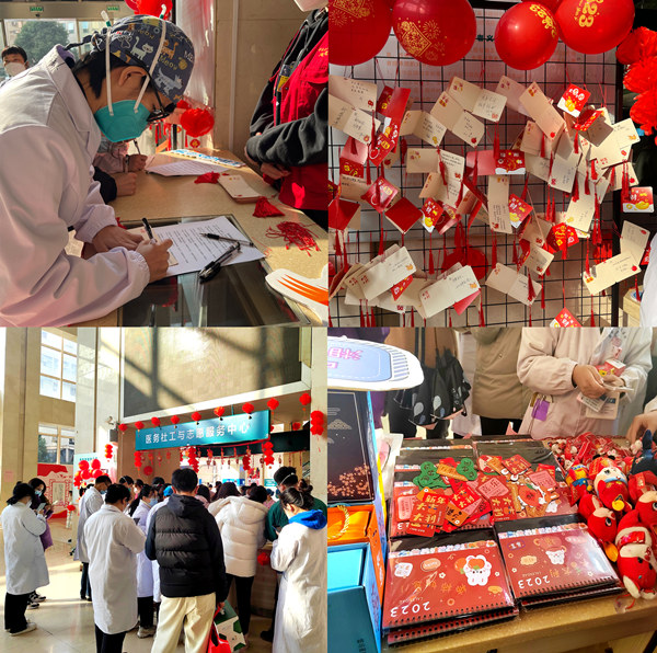 活动现场在医务社工的提前布置下显得格外喜庆,大家纷纷驻足参加活动,依次完成了“写祝福”“猜字谜”“抽好礼”三个活动环节。“写祝福”环节,大家留下“祝新湘雅越来越好,新湘雅正青春”“新春快乐,万事顺遂”“岁岁年年,万喜万般宜”等祝福语,表达了自己的新年愿望。“猜字谜”“抽好礼”环节,大家通过抽字谜赢取了餐具礼盒、兔年玩偶、新年钥匙扣、兔年冰箱贴等礼品。活动共吸引了近四百人参与,送出三百余份新春礼物。